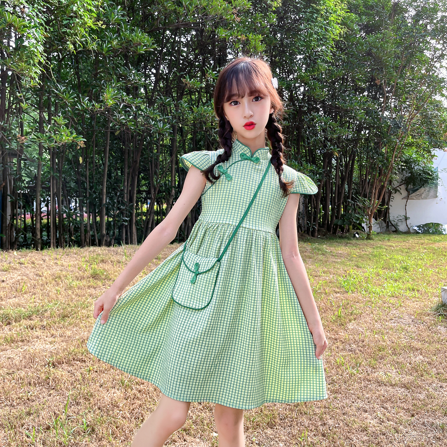 女童短袖连衣裙夏季童装洋气国风格子旗袍裙宝宝儿童时尚公主裙子热门设计联盟服务商